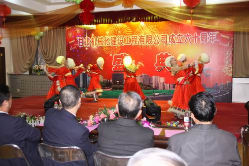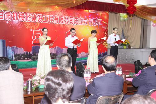 2013年3月22日下午兩點十分,甘肅機械化建設工程有限公司成立六十周年慶典大會在公司二樓大會議室舉行。公司領導、部分退休老領導、機關全體員工、各基層單位先進個人及代表出席大會。大會分兩個階段進行,公司黨委書記胡德生同志主持大會。大會第一階段,公司董事長陳想蕃先生向大會作慶典致辭,黨委書記胡德生同志作了重要講話。大會第二階段為公司文藝匯演,匯演共十二個節目,公司領導及員工歡聚一堂,表演精彩紛呈,現場氣氛非常熱烈,大會持續了近兩個小時。