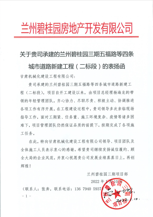1月10日,我公司收到來(lái)自蘭州碧桂園房地產(chǎn)開發(fā)有限公司的表?yè)P(yáng)函,函中提到,蘭州碧桂園三期五福路等四條城市道路新建工程(二標(biāo)段)項(xiàng)目自開工建設(shè)以來(lái),項(xiàng)目人員面對(duì)工期緊、任務(wù)重、施工環(huán)境復(fù)雜、疫情等諸多困難,在保證品質(zhì)的前提下,按期完成了各項(xiàng)施工任務(wù),提出表?yè)P(yáng)。