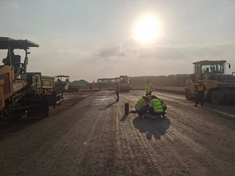 為確保試驗段攤鋪設備工作高質、高效進行,項目部統一部署,各部門相互配合,認真進行施工前各項準備工作,提前對有關人員進行安全培訓和技術交底。施工現場井然有序,項目負責人嚴格把控運輸、攤鋪、碾壓、檢測等各施工環節,保證施工質量與安全,同時對試驗段標高、壓實度、平整度和厚度等各項指標進行實時檢測并記錄,確保各項指標符合技術規范要求,并確定水穩層松鋪系數、壓路機最佳碾壓遍數及速率,最終達到預期試驗效果。